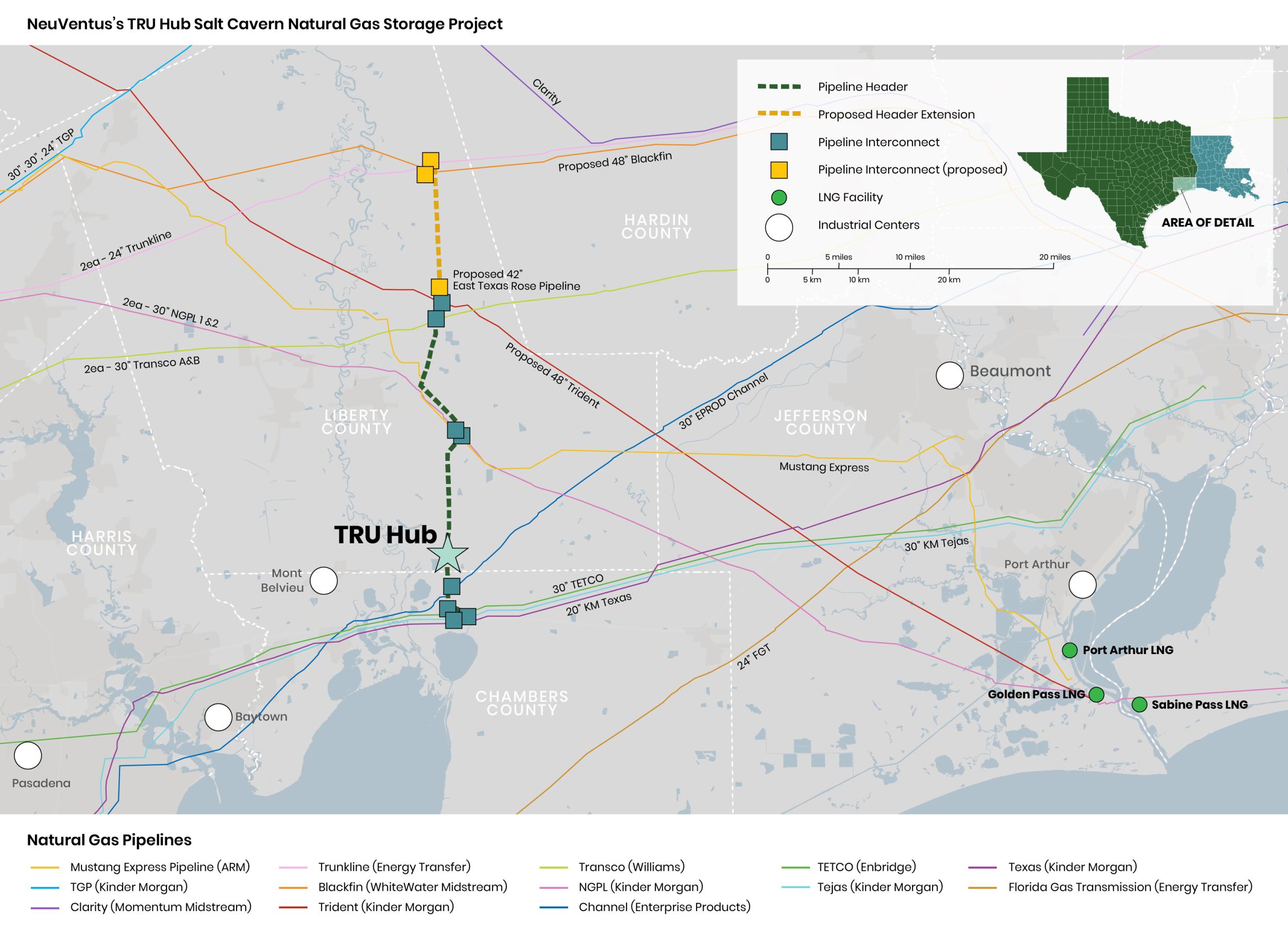 Based upon the positive results from our initial open season, NeuVentus expects the header will comprise a minimum of eight interconnections along a 28-mile segment with the potential to interconnect to Trunkline, Blackfin and Moss Rose farther north depending upon customer needs. This excellent interconnectivity will allow TRU Hub’s customers access to the reliability and flexibility of high-turn storage service in support of LNG export facilities, industrial and petrochemical demand centers (Mont Belvieu, Baytown, Beaumont, Port Arthur), midstream pipeline network operators and power generators in both the MISO South and ERCOT power grids.